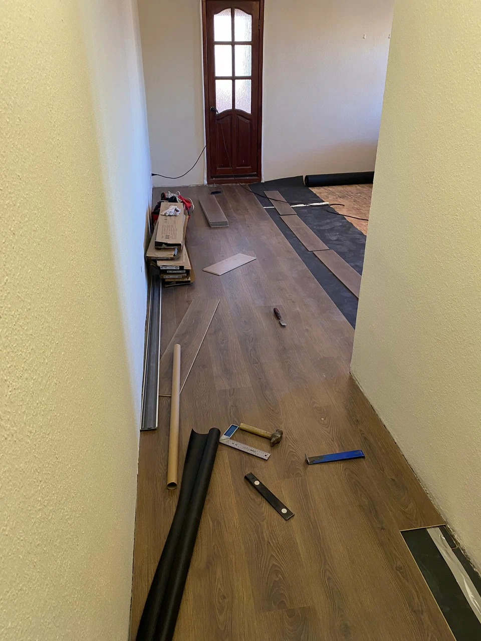Монтаж: Я пилил электролобзиком с пилками по металлу, но для всей квартиры возьму торцовочную пилу. Замки стыковались очень легко, даже подбивать не пришлось.