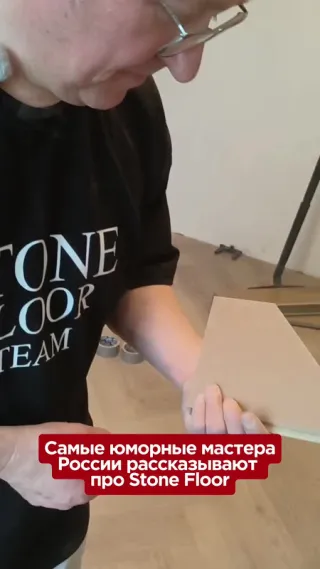 Уложили MSPC — новый материал на рынке. Каменный ламинат, так сказать, уложен ёлочкой. Много конвекторов. Примыкания к конвекторам обыграются планкой.